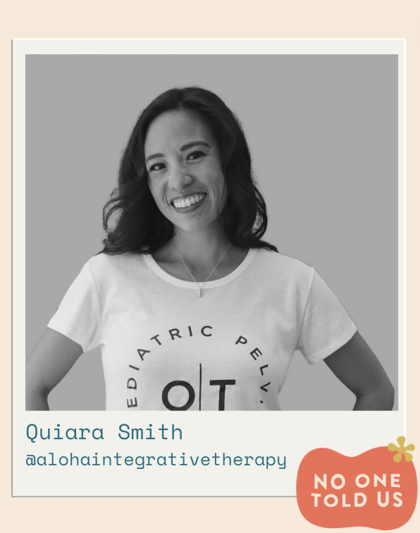 Rachael: Welcome to the No One Told Us podcast. Today I’m so excited to talk with Quiara Smith, who is a practicing occupational therapist and she’s been practicing for over 13 years in both California and Hawaii, working in various settings with infants, toddlers, children and adolescents with various medical conditions and diagnoses. Realizing the social, emotional and psychological challenges that pelvic floor dysfunction and toileting differences place on children and families, Quiara decided to narrow her private practice to exclusively treating children and adolescents with pelvic floor dysfunction and toileting challenges. Quiara, thank you so much for joining us today. I’m so excited to talk about this ’cause this is a topic that I get so many questions about over on my Instagram page, @heysleepybaby, but I feel like there’s also so many people in the parenting space that are giving really out of pocket advice about potty training. I think so, I’m always really hesitant to answer those types of questions. of questions. And I’m so glad that you’re coming on the podcast today to kind of clear some things up, teach us about pelvic floor dysfunction, potty learning, all of these things. And I’m just really excited for you to be here. Thank you so much.